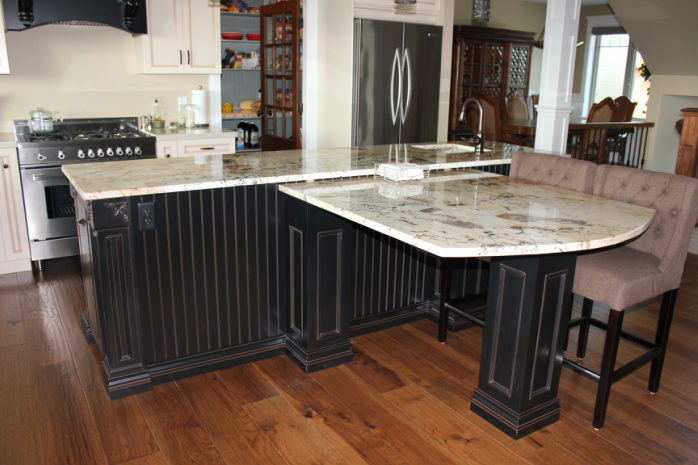 In this extensively renovated house we removed most of the interior walls in the kitchen, living room and dining room as well as a brick chimney that ran down to the basement. we moved the sink to the island area to capture the view of the lake, installed new shaker style cabinetry, granite tops, hood fan and installed a skylight. Raised the washer and dryer and built them in with a counter over and added more cabinets in the laundry room. Removed the shower and vanity in the ensuite and installed a corner tub with a rainshower and travertine surround, installed a new vanity, granite top, lights and mirror. Main bath got a new tub with a tile surround, relocated the toilet, new cabinetry, granite top, sink and flooring. Dining room was opened up, pillars removed and ceilings flattened. Exterior was resided with hardie board and a stamped concrete veranda installed as well as new doors and windows.